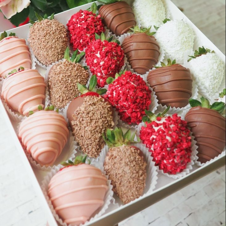 Состав: Свежая Клубника в белом, молочном и розовом бельгийском шоколаде, кокосовая стружка, сублимированная клубника, шоколадная стружка Набор перевязывается атласной ленточкой, открытка с вашим текстом в подарок Рекомендуемый срок хранения 24 часа