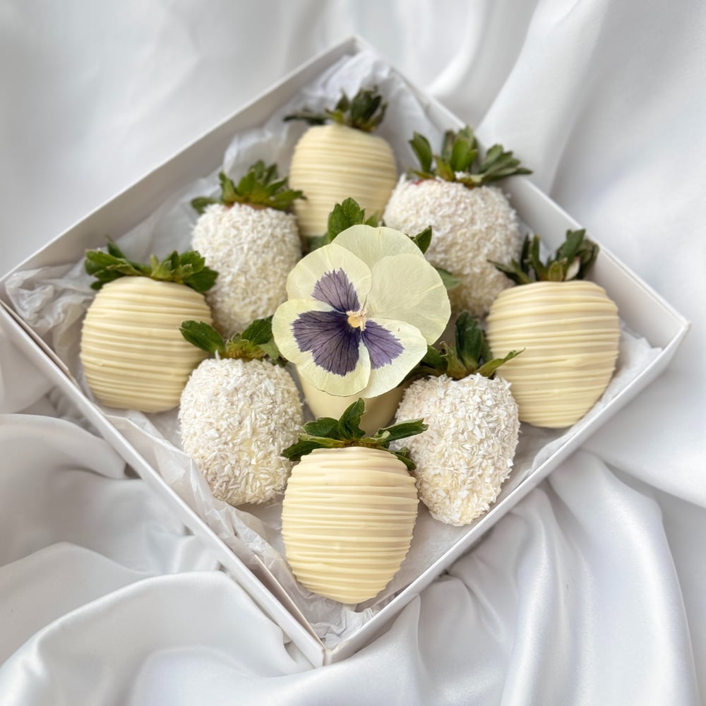 Клубника в белом шоколаде с кокосовой стружкой и сушеными цветами