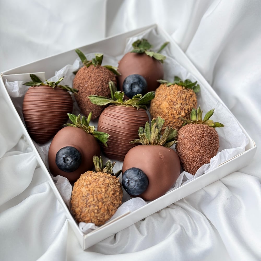 набор из клубники в молочном бельгийском шоколаде. Мы украсили свежей голубикой и вафельной крошкой. Идеальное сочетание