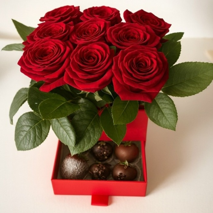 “Алый Бархат” – это воплощение роскоши и страсти! Сочетание бархатных алых роз и сочной клубники в изысканном шоколаде, представленное в элегантной шкатулке, создаёт атмосферу чувственности и восто...