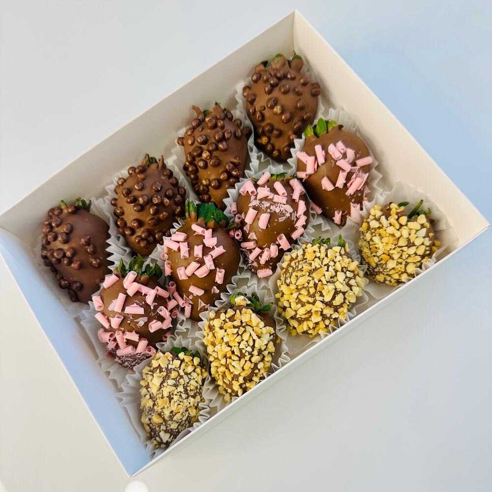 Свежая клубника в шоколаде с кондитерскими посыпками ( арахис, рисовые шарики, шоколадные завитки)