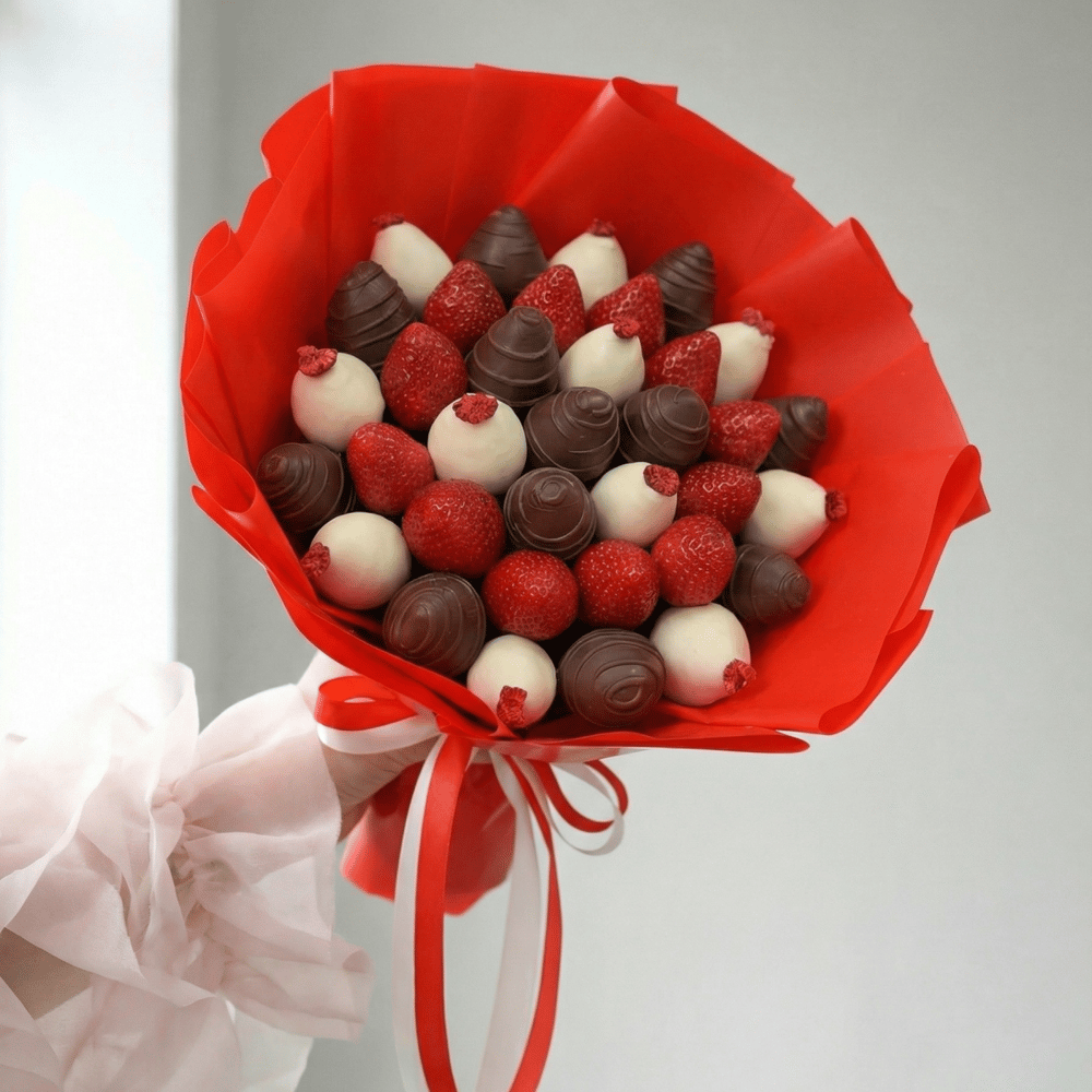 Букет в размере М: — 700 грамм свежей клубники в шоколаде — Шоколад :белый, молочный — Декор : шоколадные полоски, кусочки сублимированной малины — Композиции собираются по весу, а не по количе…