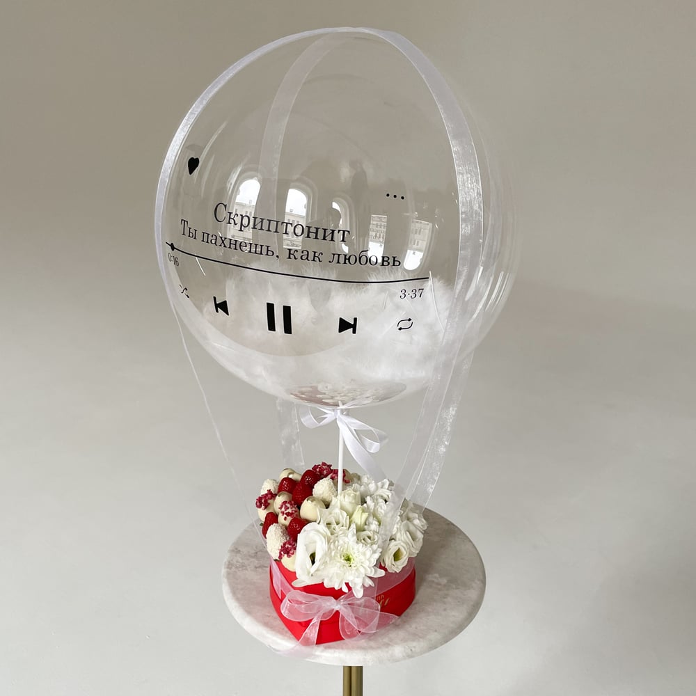— 450 грамм свежей клубники в шоколаде — микс цветов белая эустома и белая кустовая хризантема — Шоколад: белый — Декор: кокосовая стружка, сублимированная малина, золотой кандурин — Воздушный шар с перьями и надписью — Коробка в форме сердца Примечание: — Вы можете заказать индивидуальную надпись на воздушном боксе, что сделает ваш подарок оригинальным. — Композиции составляются из клубники по весу, а не по количеству, так как ягода может быть разного сорта, количество ягод может отличаться. — Бокс бережно упакован в прозрачную пленку для защиты от внешних факторов. — Натуральный продукт. Срок годности клубники в шоколаде до 24 часов. Храните ягоду в холодильнике при температуре +4..+8 градусов.