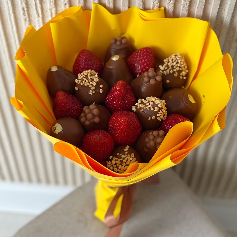 Состав: — 450 грамм свежей клубники в шоколаде — Шоколад: молочный — Декор: дутый карамелизированный рис, шоколадные хрустящие шарики, золотой кандурин Примечание: — Композиции составляются из клубники по весу, а не по количеству, так как ягода может быть разного сорта, количество ягод может отличаться — Букет бережно упакован в прозрачную пленку для защиты от внешних факторов — Натуральный продукт. Срок годности клубники в шоколаде до 24 часов. Храните ягоду в холодильнике при температуре +4..+8 градусов