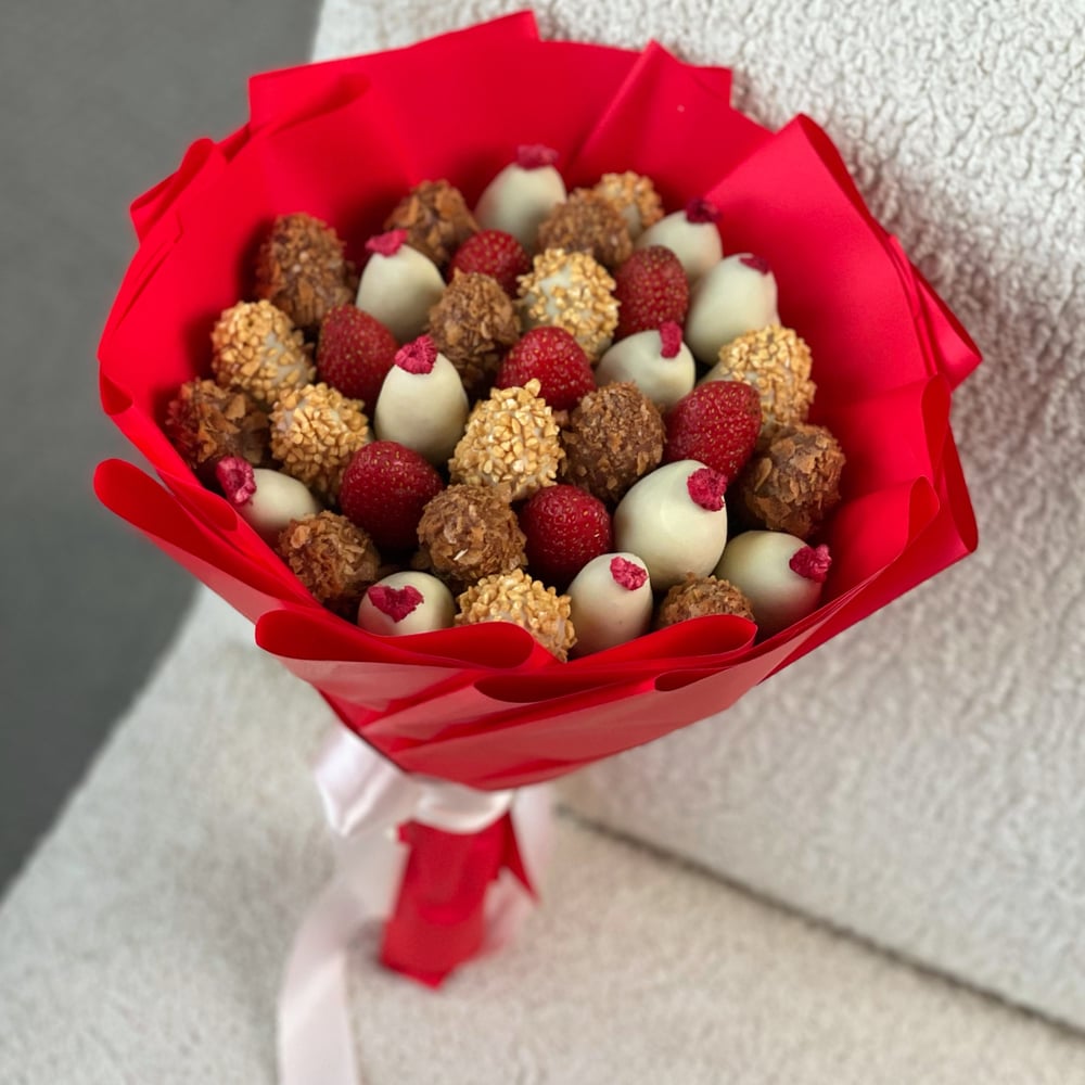 Состав: — 750 грамм свежей клубники в шоколаде — Шоколад: белый, молочный — Декор: вафельная крошка, дутый рис, кусочки сублимированной малины Примечание: — Композиции составляются из клуб...