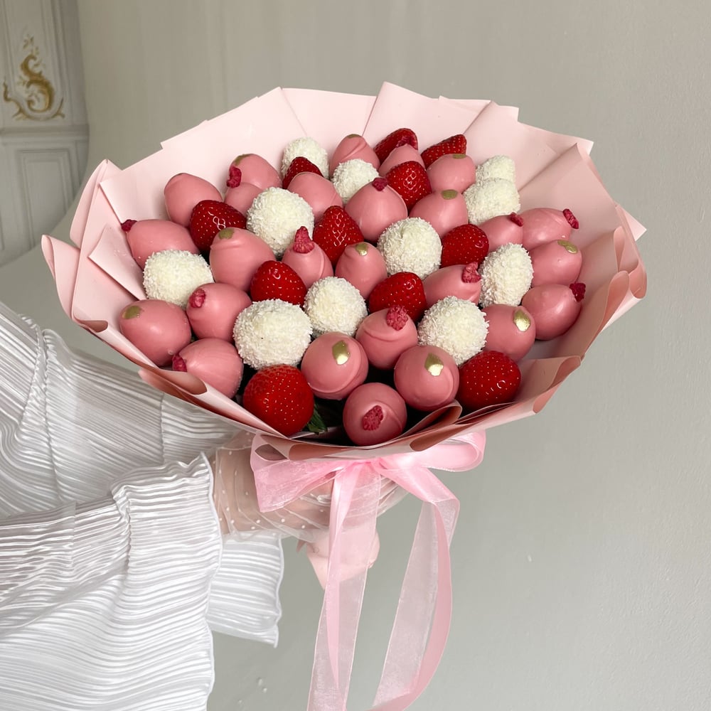 Состав: — 1050 грамм свежей клубники в шоколаде — Шоколад : белый, розовый — Декор : кокосовая стружка, золотой кандурин, кусочки сублимированной малины Примечание: — Композиции составляются из клубники по весу, а не по количеству, так как ягода может быть разного сорта, количество ягод может отличаться. — Букет бережно упакован в прозрачную пленку для защиты от внешних факторов. — Натуральный продукт. Срок годности клубники в шоколаде до 24 часов. Храните ягоду в холодильнике при температуре +4..+8 градусов.