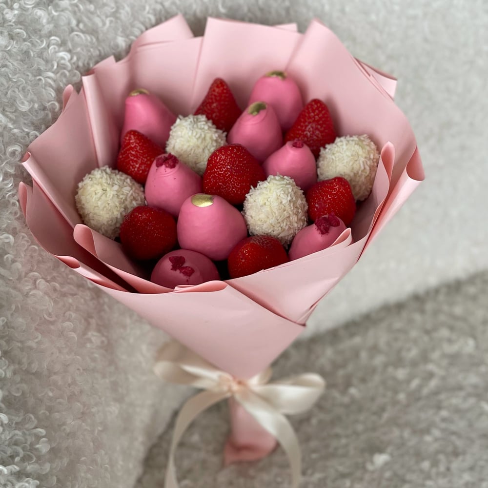 Состав: — 450 грамм свежей клубники в шоколаде — Шоколад : белый, розовый — Декор : кокосовая стружка, золотой кандурин, кусочки сублимированной малины Примечание: — Композиции составляютс...