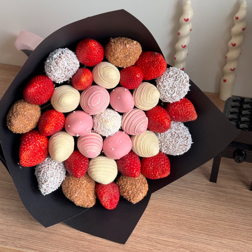 Свежая клубника в сочетании с бельгийским шоколадом даёт незабываемые впечатления. В данной композиции мы использовали белый, молочный и розовый шоколад - что привело к невероятно нежному сочетанию. Так и хочется его съесть