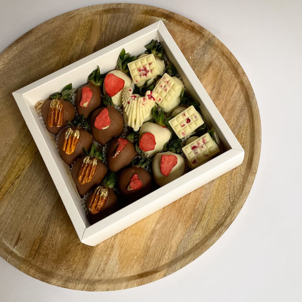 Состав: — 4 ягоды в белом шоколаде декор: сублимированная малина и орех пекан — 4 ягоды в молочном шоколаде декор: цельный орех пекан — 3 ягоды в белом шоколаде декор: слайсы сублимированной клубники — 1 ягода в белом шоколаде декор: крылья из белого шоколада и сублимированной малины — 4 ягоды в молочном шоколаде декор: мини-шоколадки из молочного бельгийского шоколада и сублимированной малины Примечание: — Клубничный набор имеет прозрачную крышку и перевязан атласной лентой с бантом — Размеры упаковки 21*21 см — Натуральный продукт. Срок годности клубники в шоколаде до 24 часов. Храните ягоду в холодильнике при температуре +4..+8 градусов