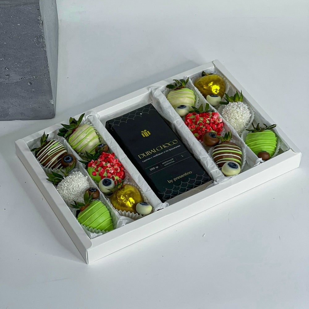 Состав: - 12 клубник в шоколаде - 10 голубик в шоколаде - дубайский шоколад 200 гр. Подробный состав шоколада: в составе: -тесто кадайф/катаифи 40 гр.; -фисташковая паста 70 гр. -кунжутный урбеч 20 гр. -мед 20 гр. -бельгийский шоколад 50 гр. (сахар, масло какао, сухое цельное молоко, какао тертое, сухая молочная сыворотка, молочный жир, соевый лецитин, ванилин, е476)