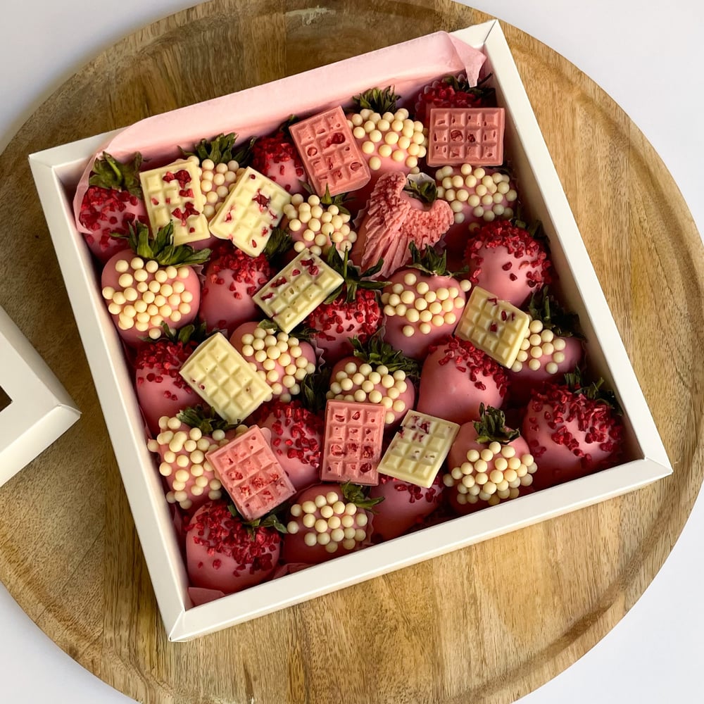 Состав: — 12 ягод в розовом шоколаде декор: шоколадные шарики — 11 ягод в розовом шоколаде декор: дробленная сублимированная малина — 1 ягода в розовом шоколаде декор: крылья из розового шоколада Примечание: — Клубничный набор имеет прозрачную крышку и перевязан атласной лентой с бантом. — Размеры упаковки 25*25 см — Натуральный продукт. Срок годности клубники в шоколаде до 24 часов. Храните ягоду в холодильнике при температуре +4..+8 градусов.