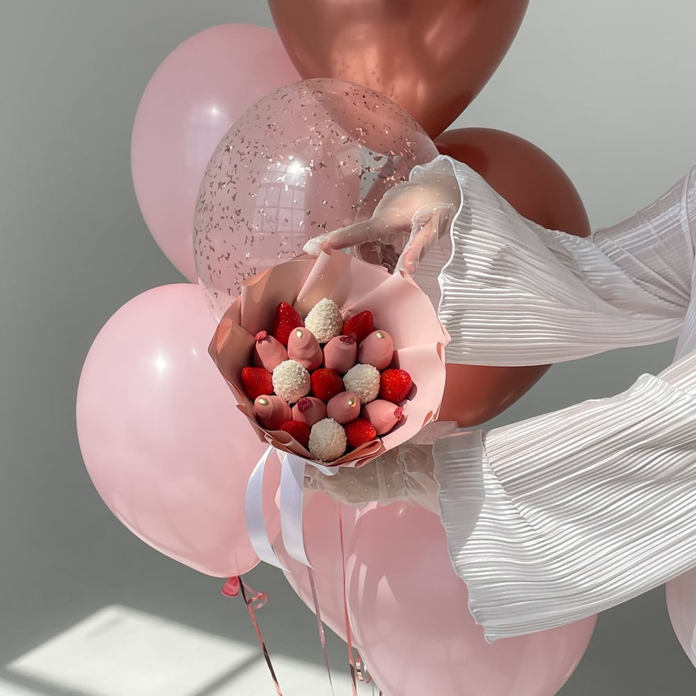 В КОМБО НАБОР ВХОДИТ: — Букет Милана S В состав букета входит : 450 грамм свежей клубники в шоколаде шоколад : белый, розовый декор : кокосовая стружка, золотой кандурин, кусочки сублимированной малины — Набор воздушных шаров : — 4 шара пастель розовый — 2 шара хром розовое золото — 1 шар с конфетти Примечание: — Композиции составляются из клубники по весу, а не по количеству, так как ягода может быть разного сорта, количество ягод может отличаться. — Букет бережно упакован в прозрачную пленку для защиты от внешних факторов. — Натуральный продукт. Срок годности клубники в шоколаде до 24 часов. Храните ягоду в холодильнике при температуре +4..+8 градусов.