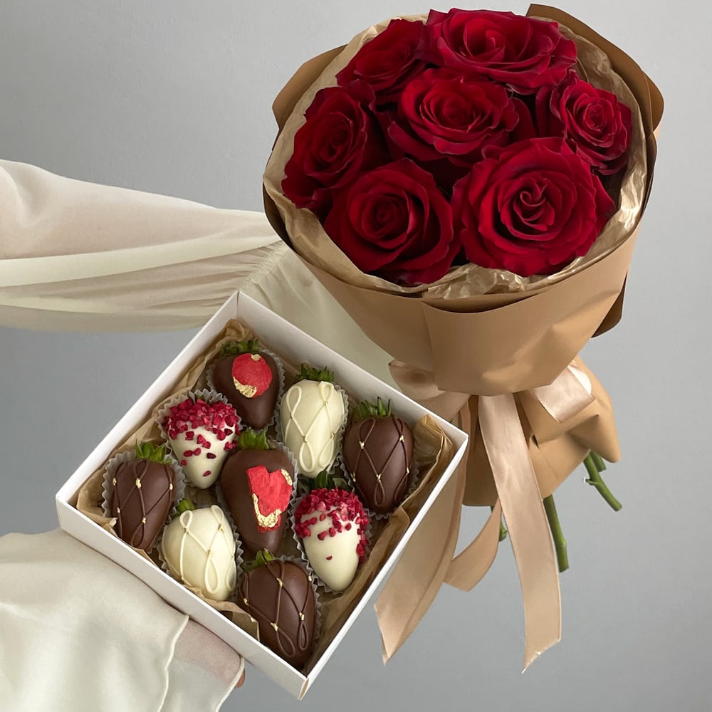 — Букет из 7 красных роз — Клубничный набор "Бостон" В состав набора входит: — 2 ягоды в белом шоколаде с декором дробленая сублимированная малина — 2 ягоды в молочном шоколаде с декором слайсы сублимированной клубники — 3 ягоды в молочном шоколаде с декором шоколадные вензеля — 2 ягоды в белом шоколаде с декором шоколадные вензеля Примечание: — Клубничный набор имеет прозрачную крышку и перевязан атласной лентой с бантом. — Размеры упаковки 15*15 см — Натуральный продукт. Срок годности клубники в шоколаде до 24 часов. Храните ягоду в холодильнике при температуре +4..+8 градусов.