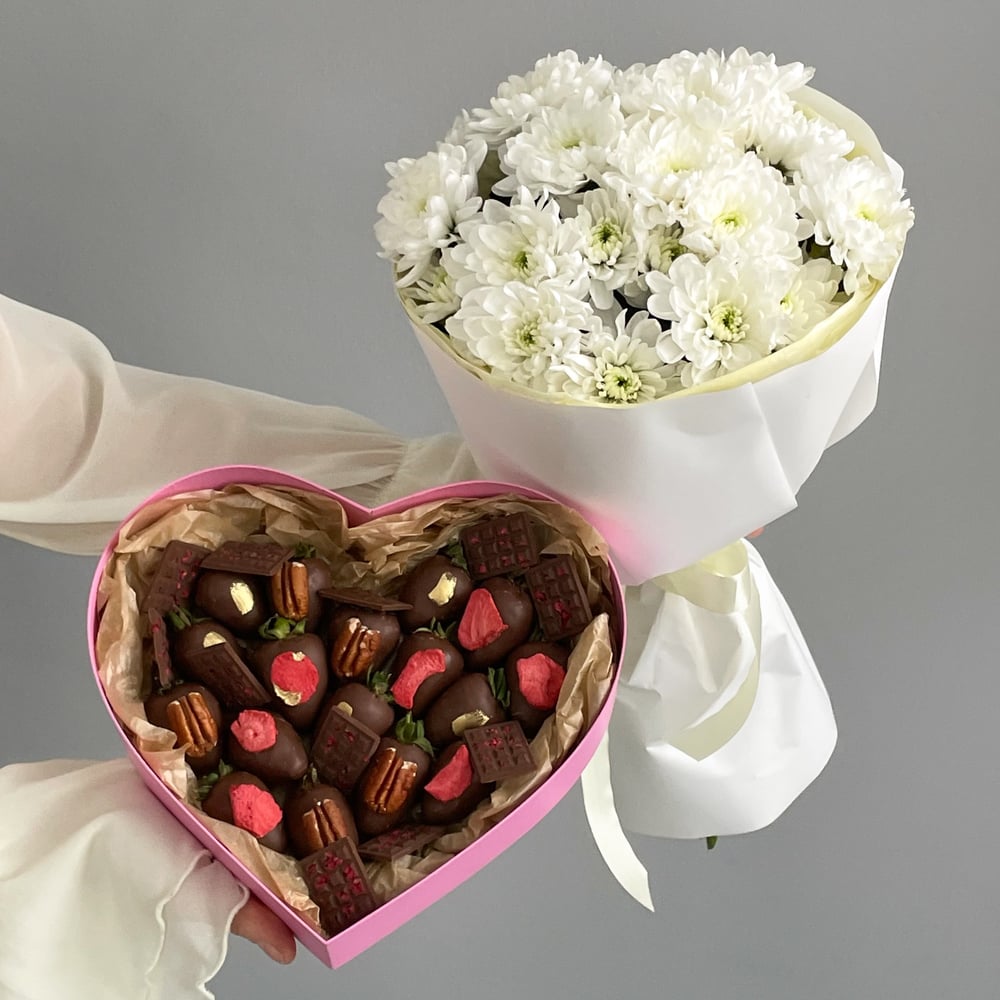 — Букет из 3 веточек кустовой хризантемы — Клубничный набор "Сердце полное любви" В состав набора входит: — 6 ягод в молочном шоколаде, декор: слайсы сублимированная клубники — 5 ягод в молочном шоколаде, декор: пекан цельный — 5 ягод в молочном шоколаде, декор: золотой кандурин — мини шоколадки из белого шоколада Примечание: — Клубничный набор форме сердца — Размеры упаковки 25*24 см — Натуральный продукт. Срок годности клубники в шоколаде до 24 часов. Храните ягоду в холодильнике при температуре +4..+8 градусов.
