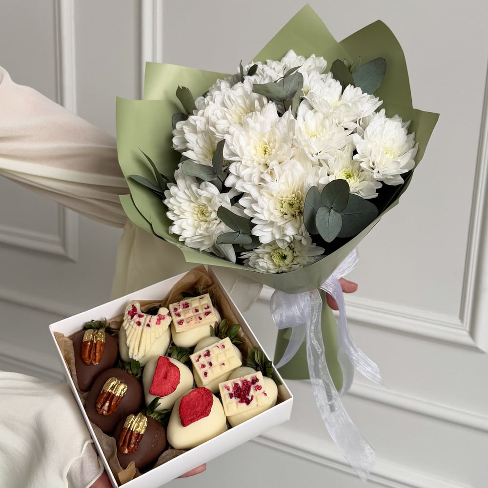 — Букет из 3 веточек белой кустовой хризантемы и эвкалипта — Клубничный набор "Чикаго" маленький В состав набора входит : — 3 ягоды в белом шоколаде, декор: сублимированная малина и орех пекан — 3 ягоды в молочном шоколаде, декор: цельный орех пекан — 2 ягоды в белом шоколаде, декор: слайсы сублимированной клубники — 1 ягода в белом шоколаде, декор: крылья из белого шоколада и сублимированной малины Примечание: — Клубничный набор имеет прозрачную крышку и перевязан атласной лентой с бантом. — Размеры упаковки 15*15 см — Натуральный продукт. Срок годности клубники в шоколаде до 24 часов. Храните ягоду в холодильнике при температуре +4..+8 градусов.