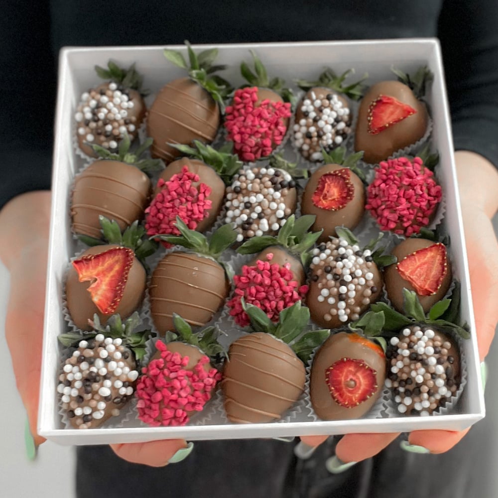 Состав свежая клубника в молочном бельгийском шоколаде украшена кондитерскими шариками дутый рис, сублимированная малина, слайсами сушеной клубники Упаковывается в коробочку с прозрачной к...