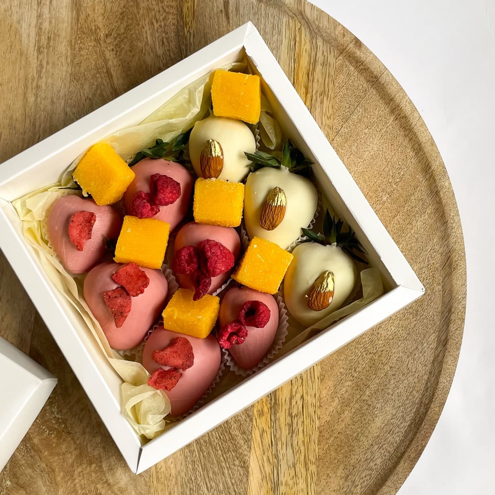 Состав: — 3 ягоды в розовом шоколаде декор: слайсы сублимированной клубники — 3 ягоды в розовом шоколаде декор: цельная сублимированная малина — 3 ягоды в белом шоколаде декор: цельный орех миндаль — натуральная конфета манго 6шт Примечание: — Клубничный набор имеет прозрачную крышку и перевязан атласной лентой с бантом. — Размеры упаковки 15*15 см — Натуральный продукт. Срок годности клубники в шоколаде до 24 часов. Храните ягоду в холодильнике при температуре +4..+8 градусов. Условия доставки Способы оплаты Срок хранения