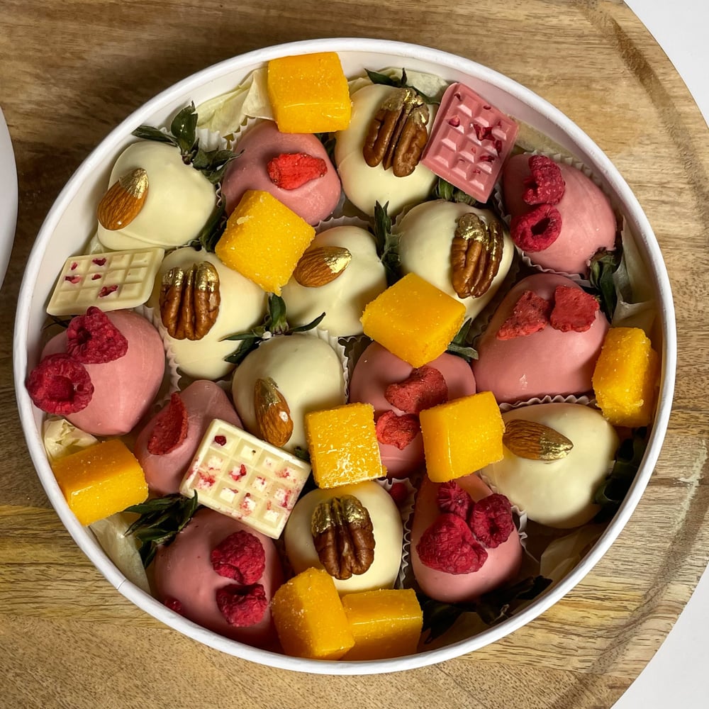 — 4 ягоды в белом шоколаде декор миндаль цельный — 4 ягоды в белом шоколаде декор пекан цельный — 4 ягоды в розовом шоколаде декор сублимированная малина — 4 ягоды в розовом шоколаде декор слайсы сублимированной клубники — Натуральная манговая конфета 9 шт Примечание: — Композиция в шляпной коробке, с прозрачной крышкой, диаметр 21 см. — Натуральный продукт. Срок годности клубники в шоколаде до 24 часов. Храните ягоду в холодильнике при температуре +4..+8 градусов.