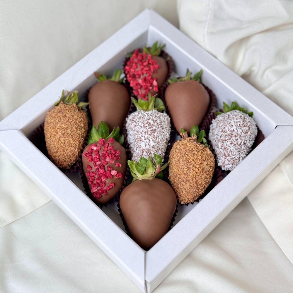 Свежая клубника в молочном шоколаде с добавлением вафли/сублимированной малины/кокосовой стружки