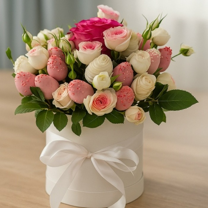 Нежные мечты – это воплощение утонченной романтики, где изысканная клубника, покрытая нежным белым и деликатным розовым шоколадом , гармонично соседствует с пышными кустовыми розовыми розами. Этот...