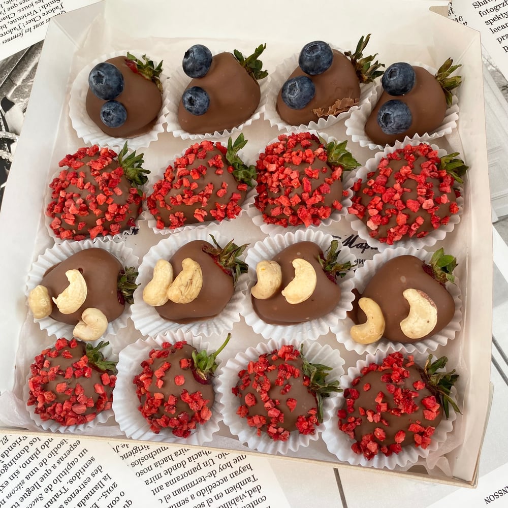 Молочный шоколад, отборная клубника, кешью, сублимированная малина, голубика