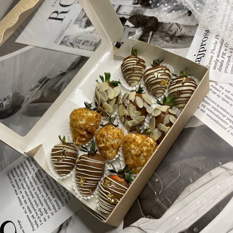 Отборная клубника,белый и молочный шоколад, миндальные лепестки, вафельная крошка, съедобное золото