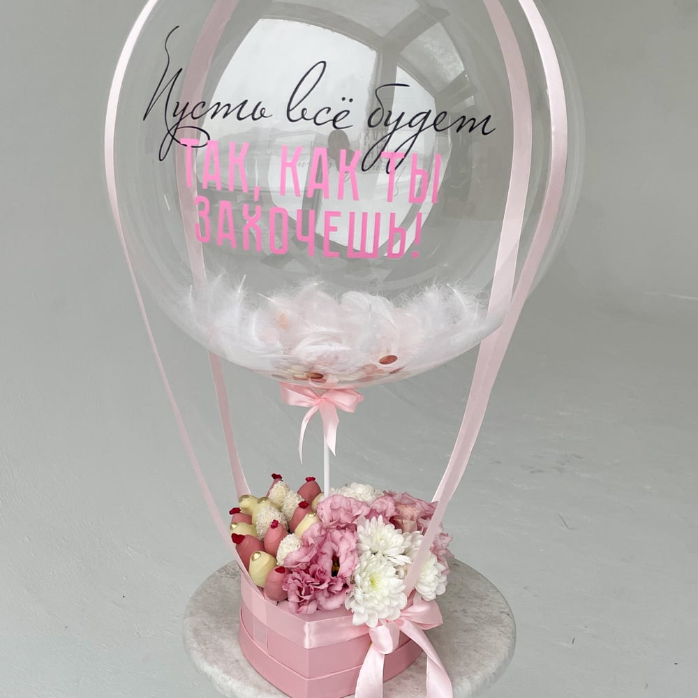 Состав: — 450 грамм свежей клубники в шоколаде — Микс цветов розовая эустома и белая кустовая хризантема — Шоколад: белый, розовый — Декор: кокосовая стружка, сублимированная малина, золотой кандурин — Воздушный шар с перьями и надписью — Коробка в форме сердца Примечание: — Вы можете заказать индивидуальную надпись на воздушном боксе, что сделает ваш подарок оригинальным. — Композиции составляются из клубники по весу, а не по количеству, так как ягода может быть разного сорта, количество ягод может отличаться. — Бокс бережно упакован в прозрачную пленку для защиты от внешних факторов. — Натуральный продукт. Срок годности клубники в шоколаде до 24 часов. Храните ягоду в холодильнике при температуре +4..+8 градусов.