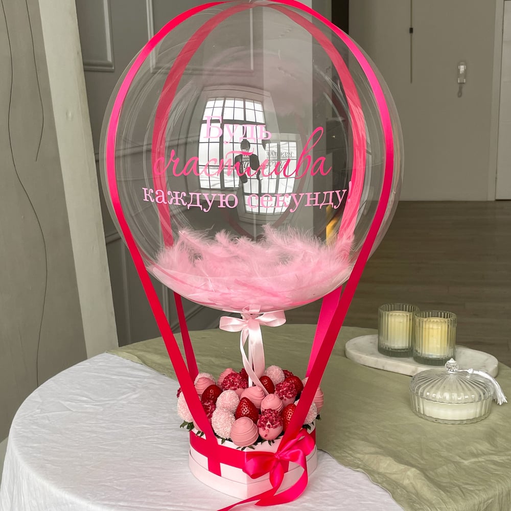 В состав набора входит: — 700 грамм свежей клубники в шоколаде шоколад: розовый декор: кокосовая стружка, кусочки сублимированной малины , шоколадные полоски — Воздушный шар с перьями и индив...