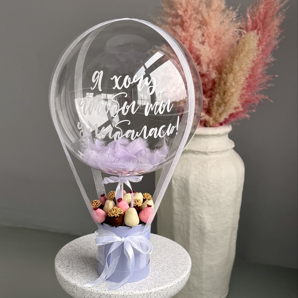 Стильная композиция для особого случая — сладость клубники + воздушный шарик! Шоколад: белый, розовый, молочный Декор: кусочки сублимированной малины, карамелизированный воздушный рис, золотой ...