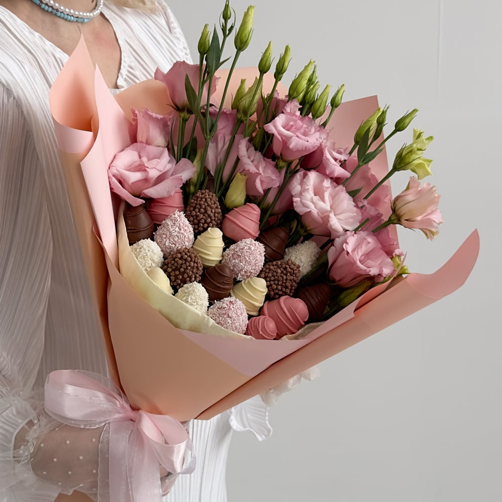 В состав букета входит : — 450 грамм свежей клубники в шоколаде количество ягод 18-21 шоколад : белый, розовый, молочный декор : кокосовая стружка, воздушный рис, шоколадные полоски — 5 веточек эустомы розовой и белой ( оттенок цветов может отличаться, в зависимости от поставки) Примечание: — Композиции составляются из клубники по весу, а не по количеству, так как ягода может быть разного сорта, количество ягод может отличаться. — Букет бережно упакован в прозрачную пленку для защиты от внешних факторов. — Натуральный продукт. Срок годности клубники в шоколаде до 24 часов. Храните ягоду в холодильнике при температуре +4..+8 градусов.