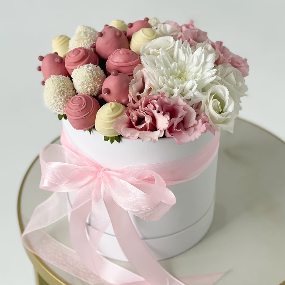 Состав: — 300 грамм свежей клубники в шоколаде шоколад: розовый, белый декор: кокосовая стружка, шоколадные хрустящие шарики, шоколадные полоски. — эустома розовая, эустома белая, хризантема бе…