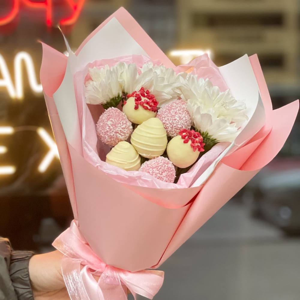 В состав букета входит: — 225 грамм свежей клубники в шоколаде количество ягод 7 — 1 пышная веточка кустовой хризантемы шоколад : розовый, белый декор : дробленная сублимированная малина, шоколадные полоски, кокосовая стружка. Примечание: — Композиции составляются из клубники по весу, а не по количеству, так как ягода может быть разного сорта, количество ягод может отличаться. — Букет бережно упакован в прозрачную пленку для защиты от внешних факторов. — Натуральный продукт. Срок годности клубники в шоколаде до 24 часов. Храните ягоду в холодильнике при температуре +4..+8 градусов.