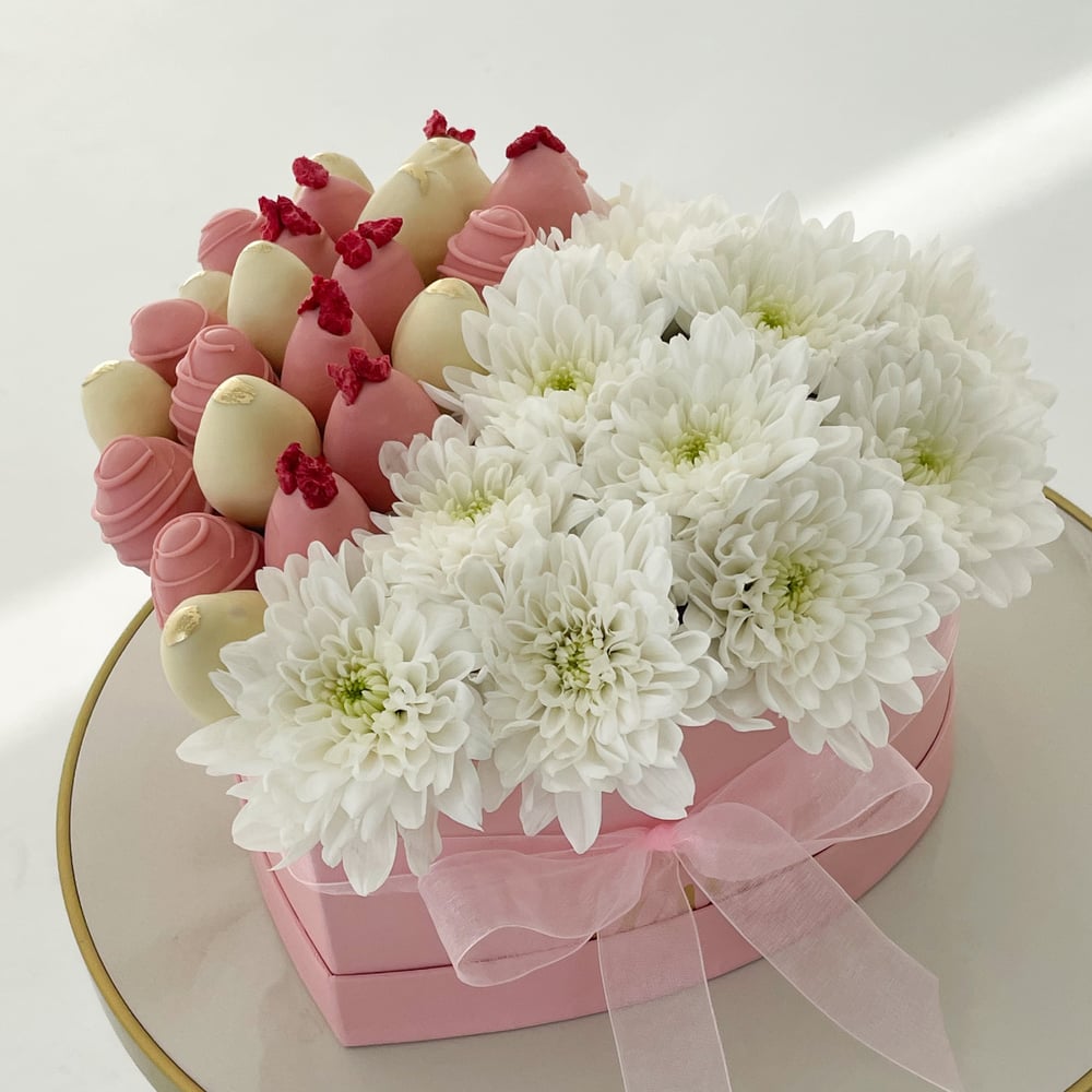 В состав набора входит: — 700 грамм свежей клубники в бельгийском шоколаде Callebaut — живые цветы белая кустовая хризантема шоколад: белый, розовый декор: шоколадные полоски, сублимированн...