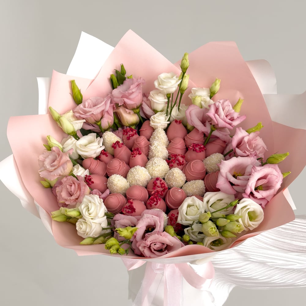 В состав букета входит : — 750 грамм свежей клубники в шоколаде количество ягод 32-34 шоколад : белый, розовый декор : кокосовая стружка, дробленная сублимированная малина — 9 веточек эустомы розовой и белой ( оттенок цветов может отличаться, в зависимости от поставки) Примечание: — Композиции составляются из клубники по весу, а не по количеству, так как ягода может быть разного сорта, количество ягод может отличаться. — Букет бережно упакован в прозрачную пленку для защиты от внешних факторов. — Натуральный продукт. Срок годности клубники в шоколаде до 24 часов. Храните ягоду в холодильнике при температуре +4..+8 градусов.