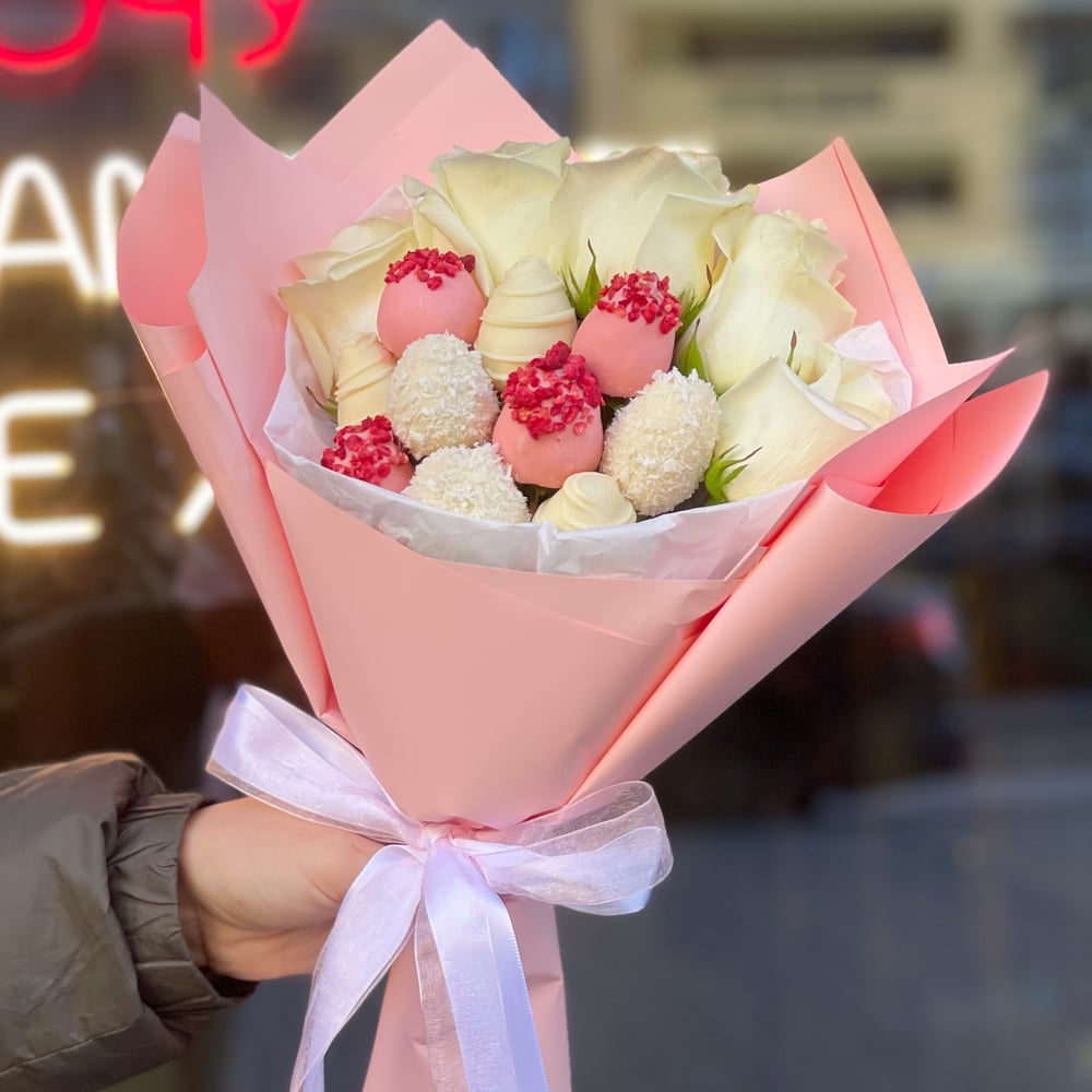 В состав букета входит: — 300 грамм свежей клубники в шоколаде количество ягод 10 — 5 белых роз шоколад : розовый, белый декор : дробленная сублимированная малина, шоколадные полоски, коко...