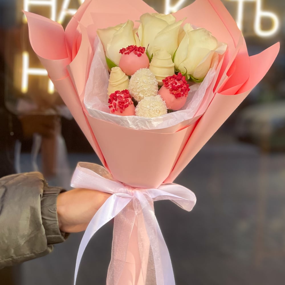 В состав букета входит: — 225 грамм свежей клубники в шоколаде количество ягод 7 — 3 белые розы шоколад : розовый, белый декор : дробленная сублимированная малина, шоколадные полоски, кокосовая стружка. Примечание: — Композиции составляются из клубники по весу, а не по количеству, так как ягода может быть разного сорта, количество ягод может отличаться. — Букет бережно упакован в прозрачную пленку для защиты от внешних факторов. — Натуральный продукт. Срок годности клубники в шоколаде до 24 часов. Храните ягоду в холодильнике при температуре +4..+8 градусов.