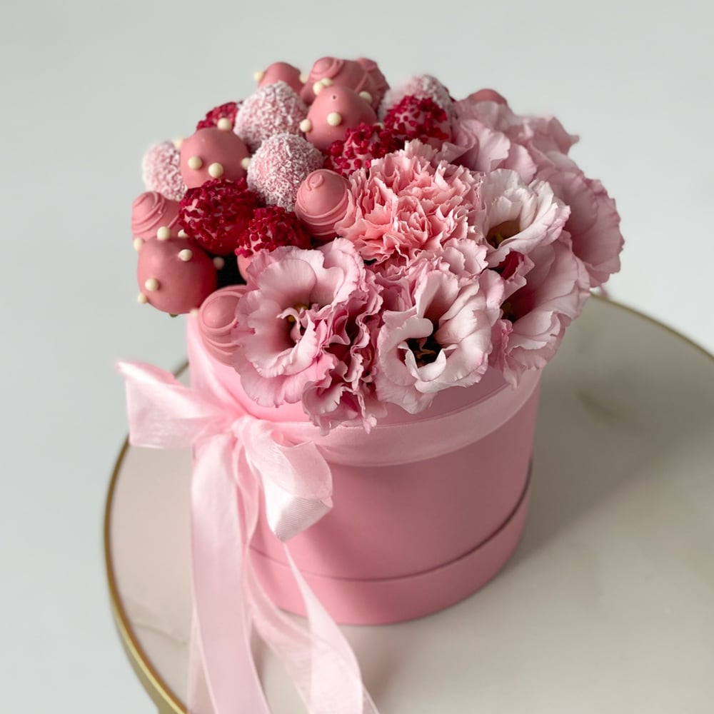 Состав: — 300 грамм свежей клубники в шоколаде шоколад: розовый декор: кокосовая стружка, шоколадные хрустящие шарики, кусочки сублимированной малины, шоколадные полоски — эустома розовая, диа...