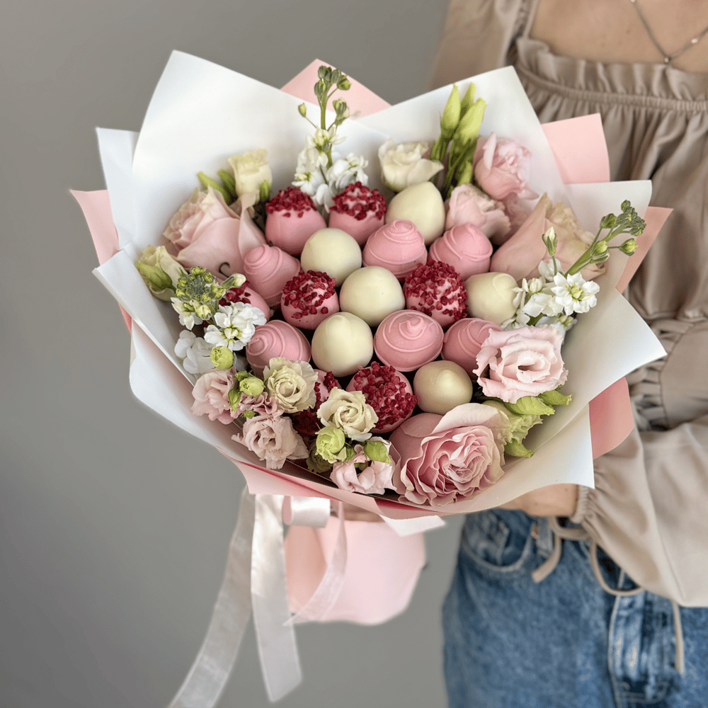 — 450 грамм свежей клубники в шоколаде количество ягод 19 шоколад: белый, розовый декор: шоколадные полоски, дробленная сублимированная малина — 3 веточки эустомы розовой, 3 веточки белой маттиолы, 3 розовые розы — Композиции собираются по весу, а не по количеству: ягоды могут отличаться по размеру и сорту, поэтому точное количество может варьироваться — В букете 450 г клубники, примерно 18-21 ягодка — Примерный размер: 50 см в диаметре, 50 см в высоту — каждый букет уникален, ведь он создаётся вручную — Внутри — брошюра с информацией о сроке годности, хранении и транспортировке — Дизайнерская упаковка с атласной лентой 🎀 — Клубника бережно упакована в прозрачную плёнку — для защиты от внешних факторов и от контакта с цветами — Цветы установлены на акваножке — специальной упаковке с водой для поддержания свежести — В каждый букет добавляется инструкция по уходу за цветами и кризал — подкормка для срезанных растений — Натуральный продукт. Срок годности — до 24 часов. Хранить в холодильнике при температуре +4…+8°C ❄️