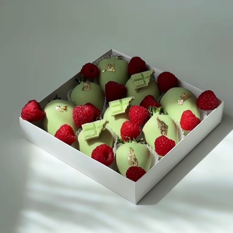 Отборная клубника, малина, шоколад со вкусом фисташки, съедобное золото