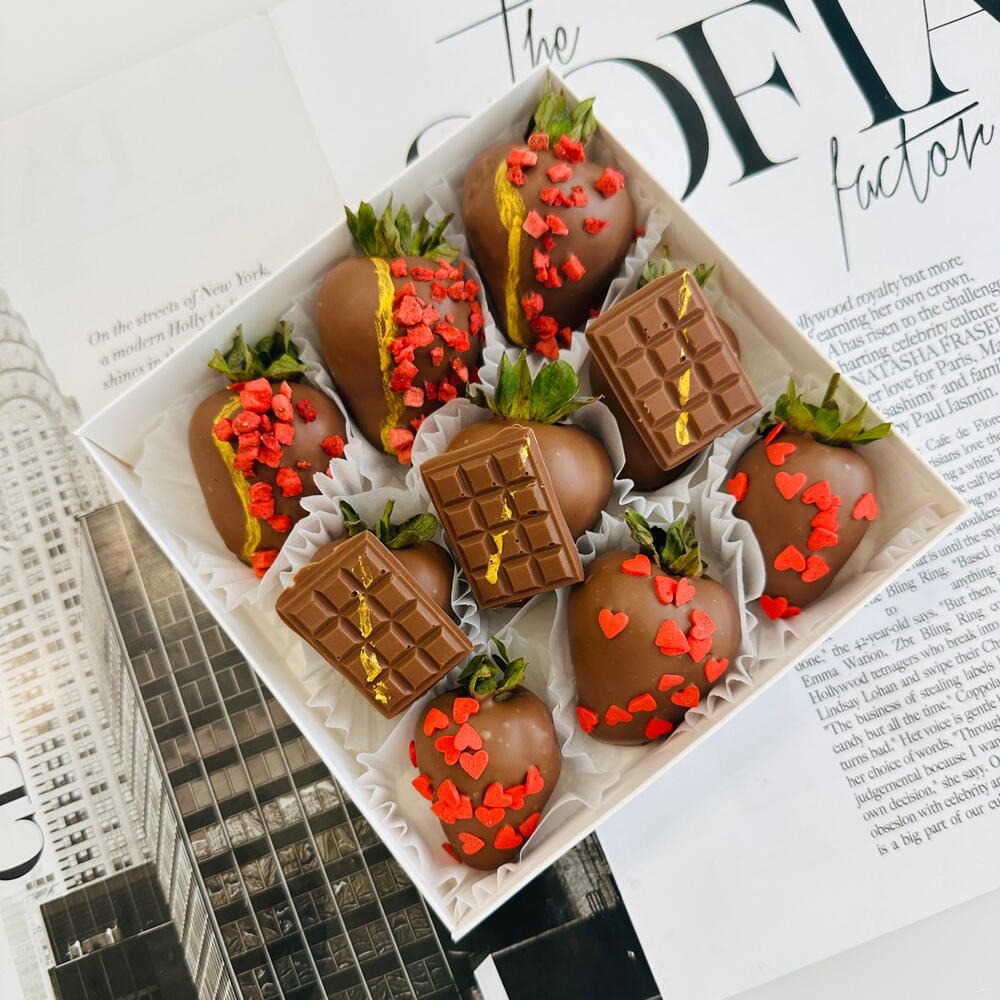 Свежая клубника в бельгийском шоколаде с кондитерскими посыпками, сублимированной клубникой. 9 штук.