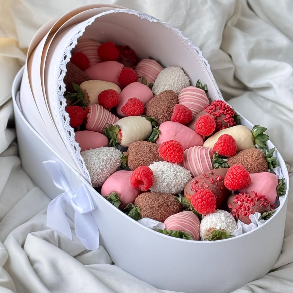 Самая милая композиция. Люлечка с клубникой в шоколаде в розовых тонах. Самая часто заказываемая композиция, чтобы отблагодарить глав врача. Можно сделать в голубом исполнении для мальчика