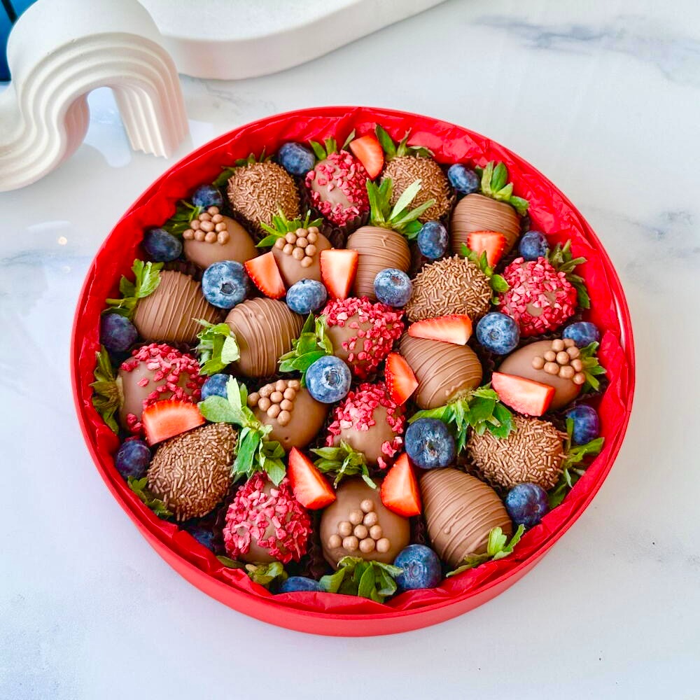 Премиум набор в круглой коробке с клубникой в шоколаде и голубикой. Идеальный подарок по любому поводу! Клубника свежая (27-30 штук) Голубика свежая Молочный бельгийский шоколад Barry Calleba...