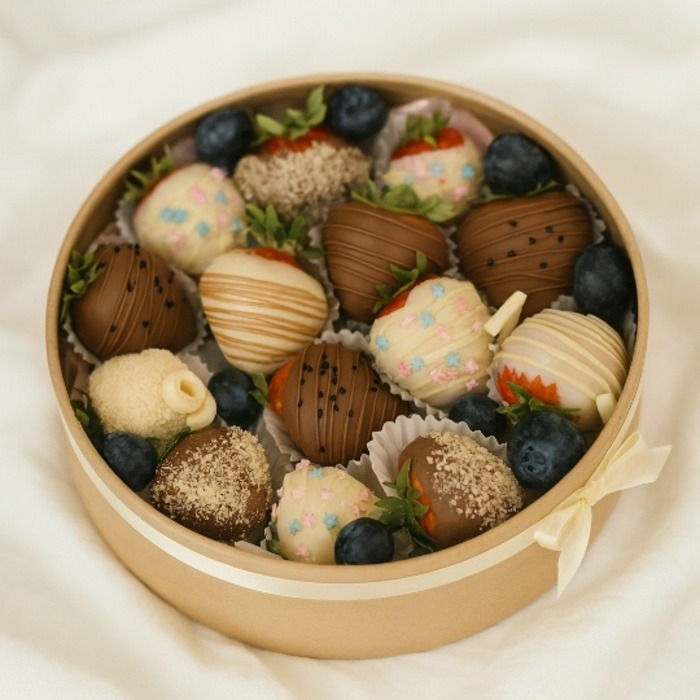 Ягодный комплимент – это искренний и теплый знак внимания, оформленный с природным изяществом😌 Отборная, свежая клубника, покрытая нежным бельгийским шоколадом, идеально дополнена уютной круглой к...