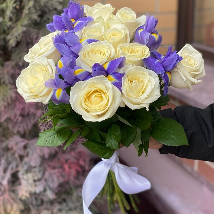 Букет из ирисов и белых роз.