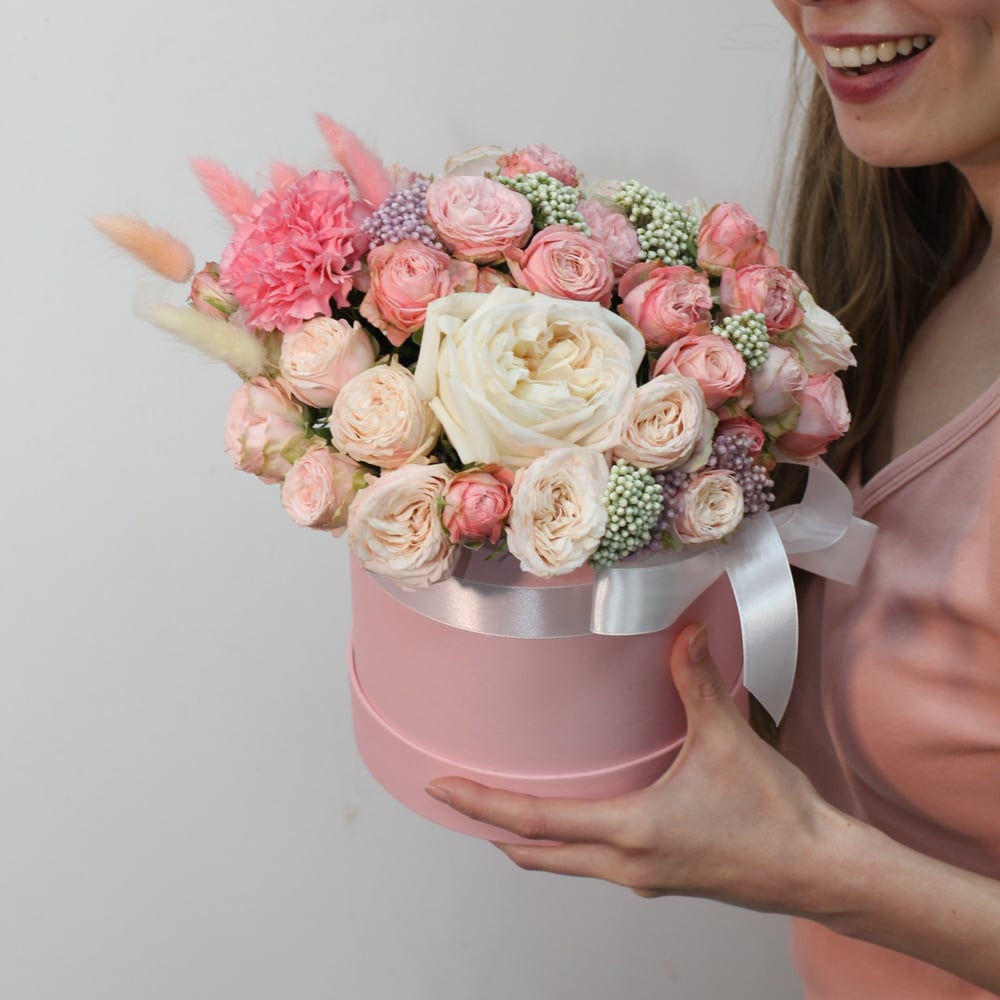 Шляпная коробка с цветами «Кокетливая улыбка» из роз и гвоздик