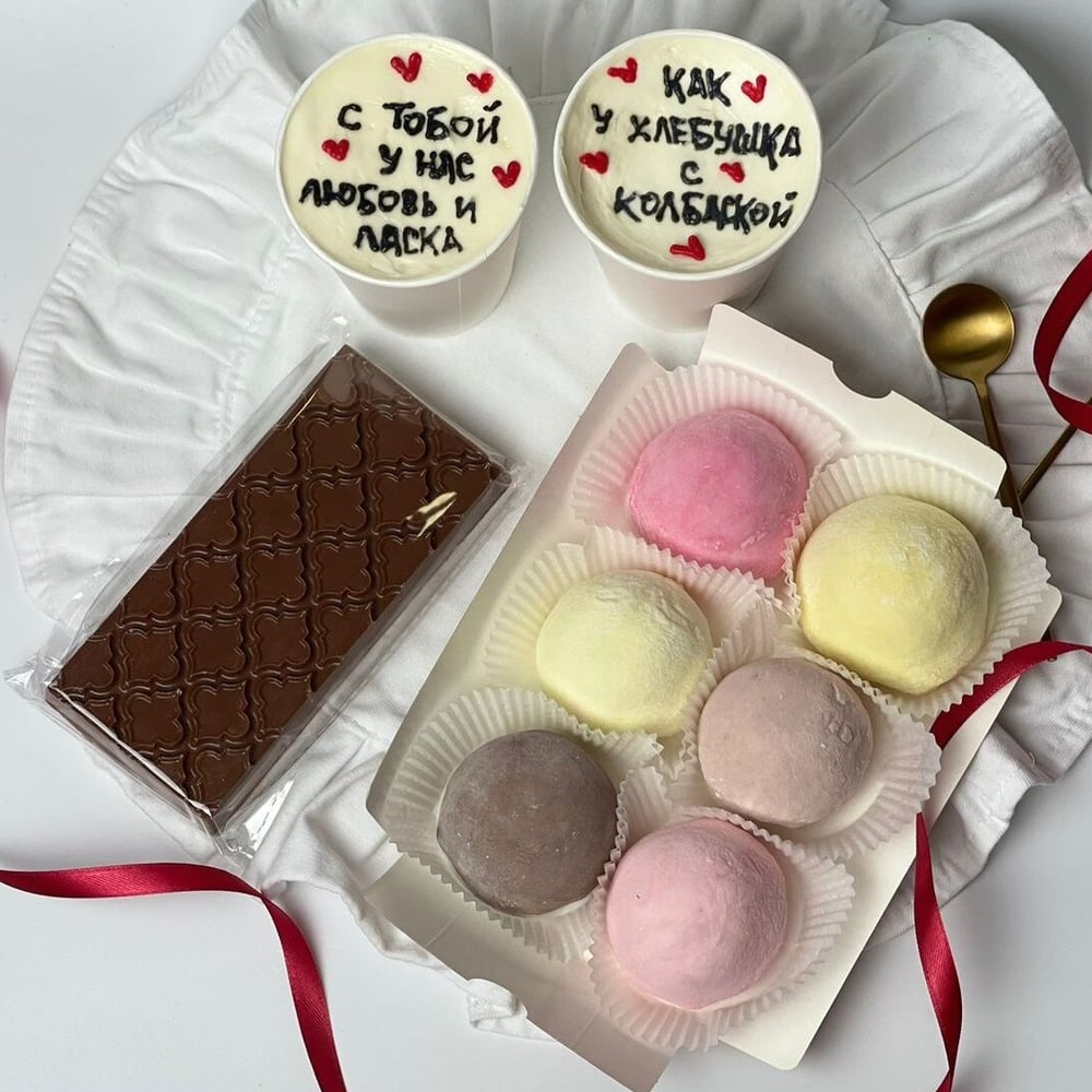 Дубайский шоколад: Катаифи, молочный шоколад Callebaut (состав: какао тёртое, сахар, масло какао, сухое цельное молоко, эмульгатор: соевый лецитин, натуральный ароматизатор ваниль. Содержание какао не менее 33%, бельгийский), фисташка, тахини. Моти: рисовая мука, подсолнечное масло, ваниль, кукурузный крахмал, инвертный сахар, клубника, банан, лайм, манго, маракуйя, творожный сыр, сливки 33%, вода. Cake to go: пшеничная мука, яйца, сахар, творожный сыр, сливки, ягоды, какао, разрыхлитель