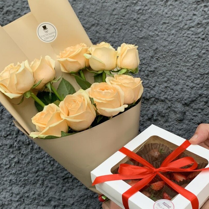 Подарок, который точно удивит! - 9 отборных ягод из солнечной Армении. Ароматная клубника в натуральном бельгийском молочном шоколаде с сушеной малиной. - Монобукет из 9 персиковых роз высотой 50 см Размер коробки: 15х15х4 см *Кол-во клубник в наборе может изменяться в зависимости от калибра ягод. Каждый набор мы перевязываем атласной лентой, дополняем карточкой с рекомендациями по хранению, фирменным пакетом для удобной транспортировки. Bon Appètit! Быстрая доставка в день заказа. Порадуйте близких на 8 Марта, выпускной, День знаний, День матери, День Победы, день рождения, день свадьбы, День святого Валентина, День семьи, День учителя, рождение ребенка, юбилей.