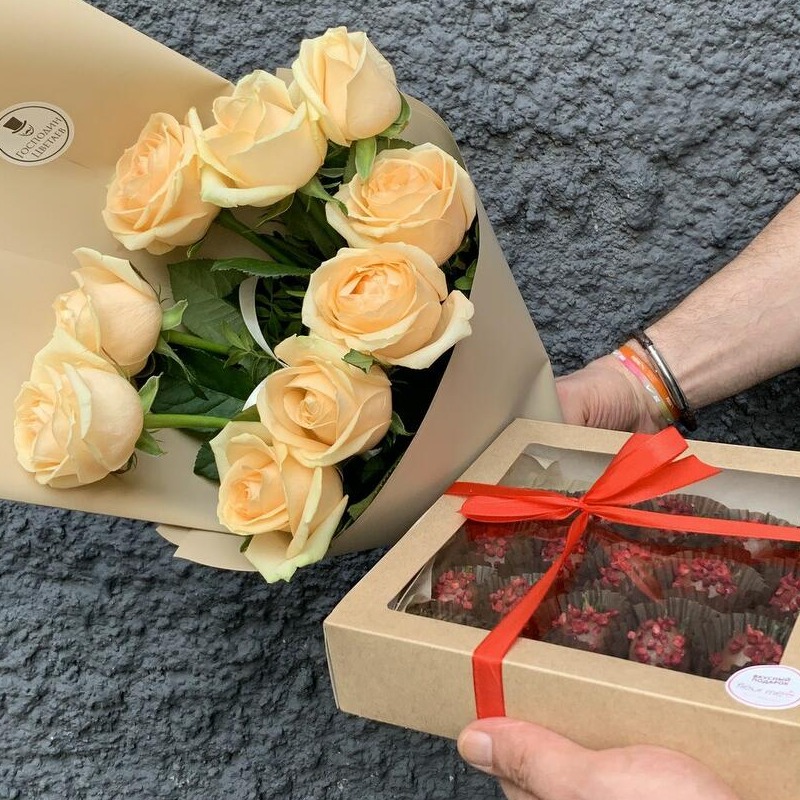 Подарок, который точно удивит! - 20 отборных ягод из солнечной Армении. Ароматная клубника в натуральном бельгийском молочном шоколаде с сушеной малиной. - Монобукет из 9 персиковых роз высотой ...