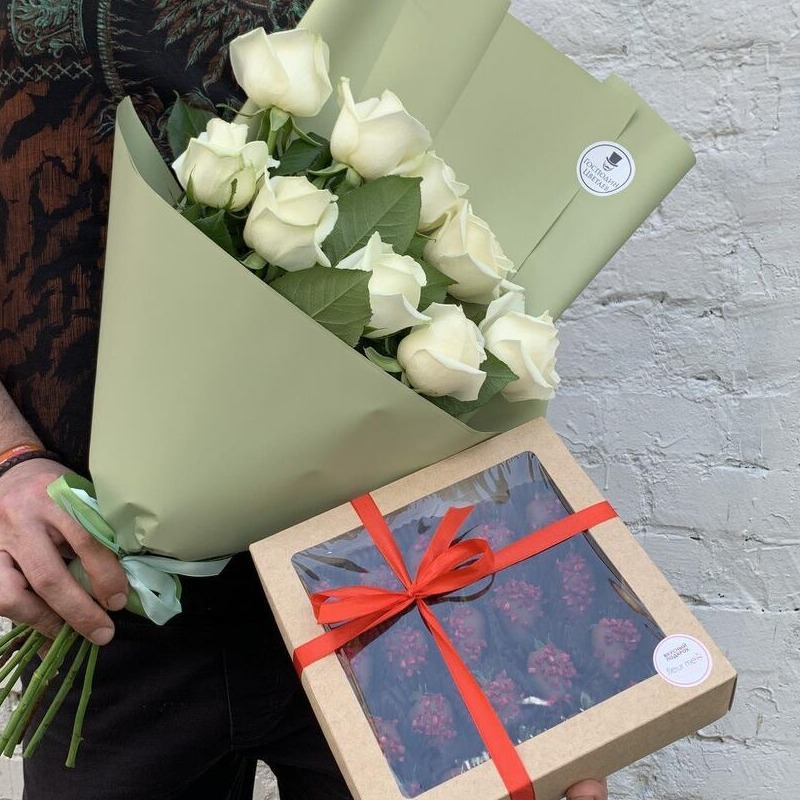 Подарок, который точно удивит! - Отборные ягоды из солнечной Армении. Ароматная клубника в натуральном бельгийском молочном шоколаде с сушеной малиной. - Монобукет из 9 белых роз высотой 50 см ...