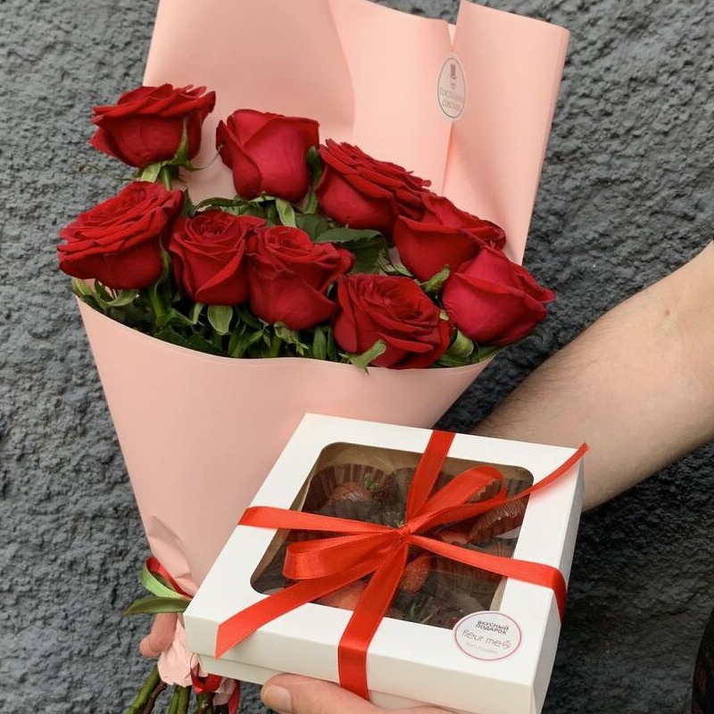 Подарок, который точно удивит! - 9 отборных ягод из солнечной Армении. Ароматная клубника в натуральном бельгийском молочном шоколаде с сушеной малиной. - Монобукет из 9 красных роз высотой 50 см Размер коробки: 15х15х4 см *Кол-во клубник в наборе может изменяться в зависимости от калибра ягод. Каждый набор мы перевязываем атласной лентой, дополняем карточкой с рекомендациями по хранению, фирменным пакетом для удобной транспортировки. Bon Appètit! Быстрая доставка в день заказа. Порадуйте близких на 8 Марта, выпускной, День знаний, День матери, День Победы, день рождения, день свадьбы, День святого Валентина, День семьи, День учителя, рождение ребенка, юбилей.